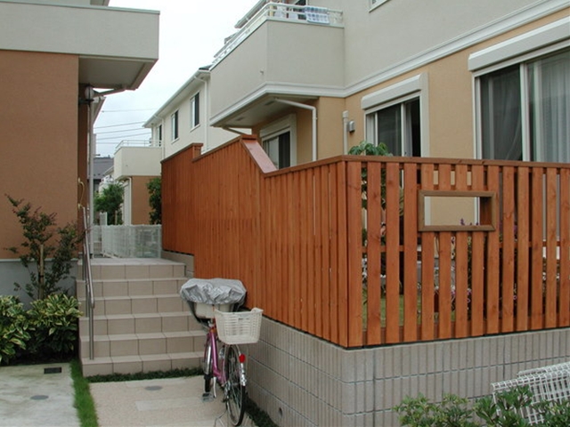 ウッドフェンス[施工後]お隣さんとの程よい目隠しになること、風通しをよくすることを考えてこのようなデザインに -