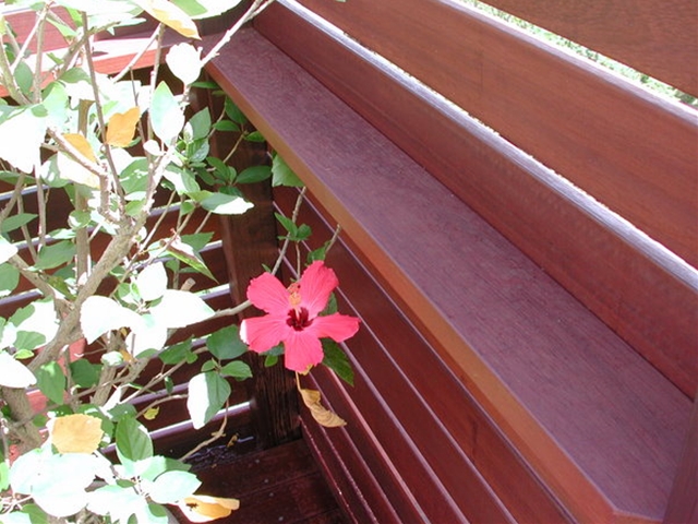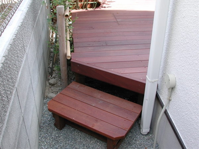 ウッドデッキの階段[施工後]デッキへのステップに余ったウリン材を用いて階段を作りました。気持ちばかりのサービス品です -