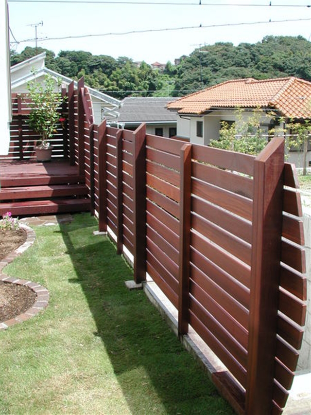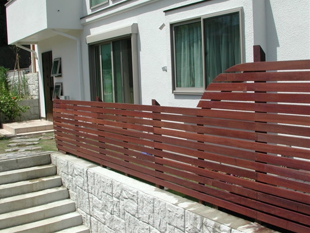 ウッドフェンス[施工後]フェンスはこのようになりました。フェンス材を横張りにして距離感を出しています -