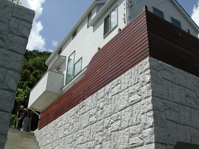 ウッドフェンス[施工中]高所の擁壁の上でフェンス材を一枚一枚張っていきました -