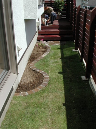 花壇と芝[施工]通路には芝を張り、花壇も設けました。イタリア斑岩のピンコロでウリン材と色調を合わせています -
