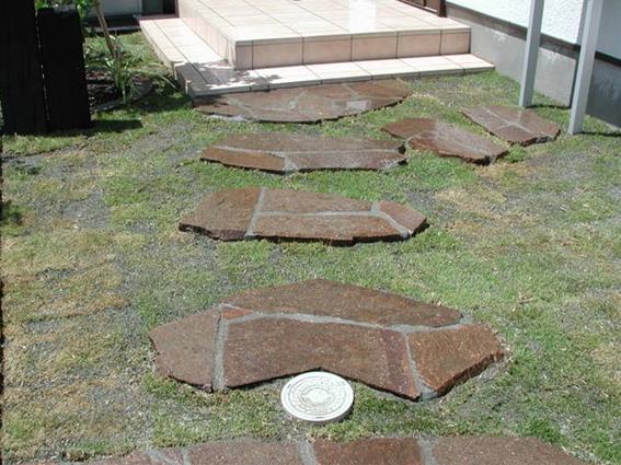 玄関への飛び石[施工後]玄関へのアプローチに、芝のなかにイタリア斑岩の石で飛び石を施工しました -