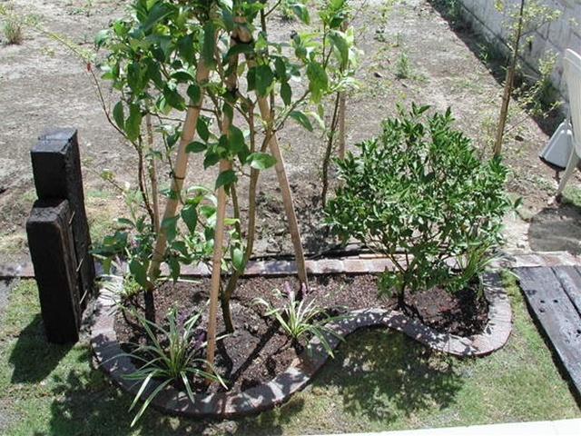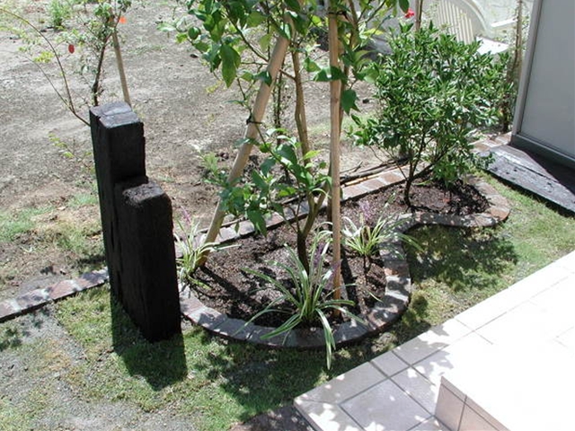 玄関前の植栽[施工後]玄関前にも花壇を設け、レモンとキンカンを植えました -