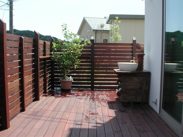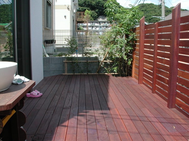 ウリン材のデッキとフェンス、シックで飽きの来ないお庭