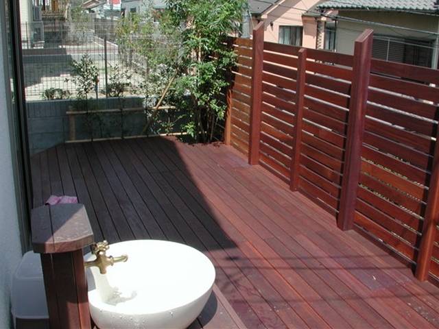 水道台[施工後]水道の台にもこだわっています。これもウリン材を用い、装飾にタイの山岳民族のチークの瓦を使用 -