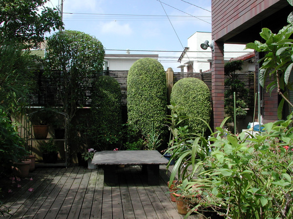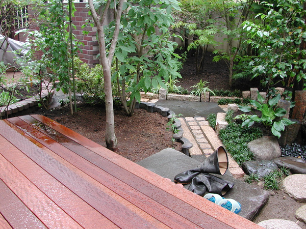 ウッドデッキからの眺め[施工後]こちらに見えるのは、ムクゲ、ツツジ、メグスリノキ、カエデ、ヤブラン、ツバキなどなど -