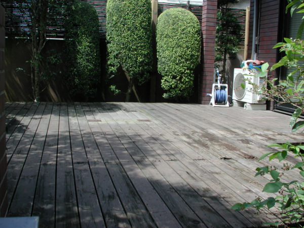 施工前腐朽してきたウッドデッキを取り払うのに併せ、庭を全面的に作り変えていきます。 -