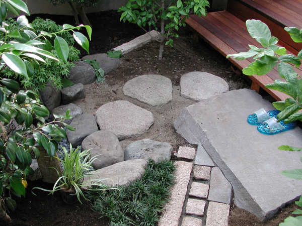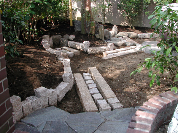 小道[施工中]鉄平石と御影石で小道を作っていきます。視覚的な変化を与えるため、左側には土を盛り起伏をつけています。 -