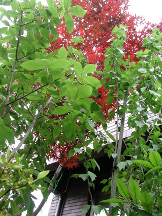 下からの眺め[施工後]下から仰ぎ見れば、メグスリノキ、ムクゲの上に色を添えるノムラカエデ -