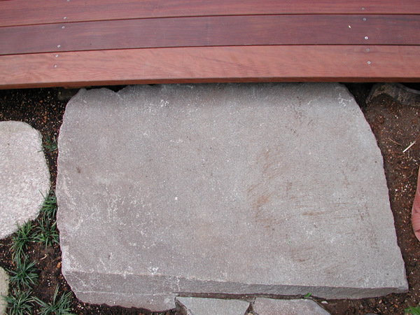 デッキと沓脱ぎ石[施工中]小道を進んだところには、沓脱ぎ石に鉄平石の大盤を据え、新たに造ったイタウバのウッドデッキへと繋ぎます。 -
