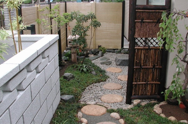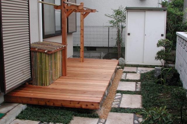 植栽、敷石、袖垣などを整え和風の小庭を造りました