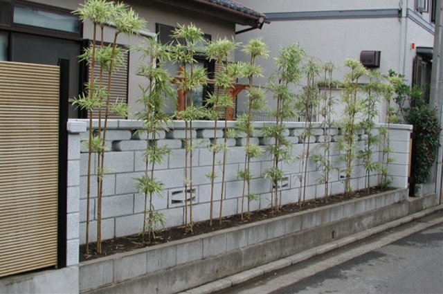 大名竹(ダイミョウチク)による生垣です。背部のブロックの積み方も工夫しています