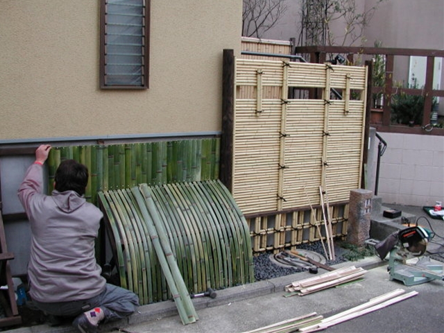 竹垣、門扉、植栽などの施工をしています。老朽化した竹垣が新たに生まれ変わり、美しい景色を造ることができました。